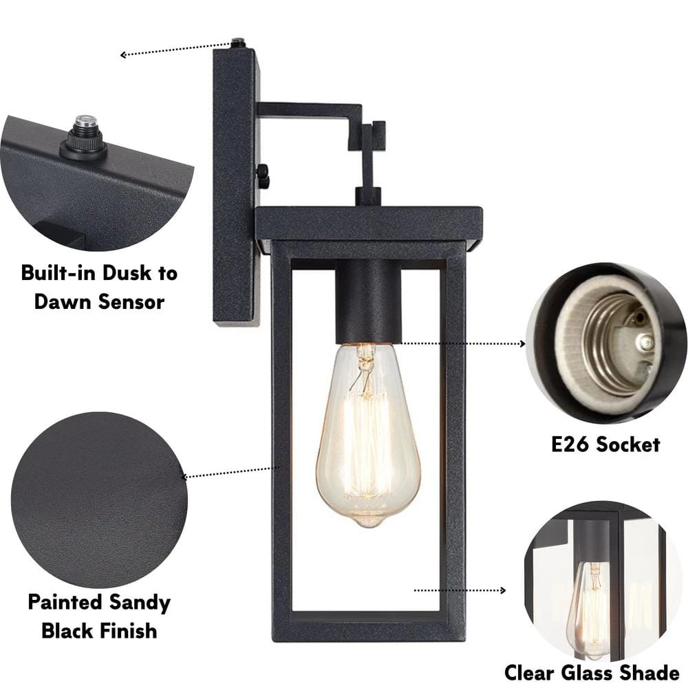 As a contemporary interpretation of traditional lantern, this clean-lined outdoor lighting to wrap your home in a warm and welcoming glow. Crafted by clear glass panes and neat lines frame, it’s perfect to add a classic vibe to the exterior of your home, under a covered porch, patio or veranda. With built-in dusk to dawn sensor on top, the fixture will automatically turn on at night and turn off on daytime.