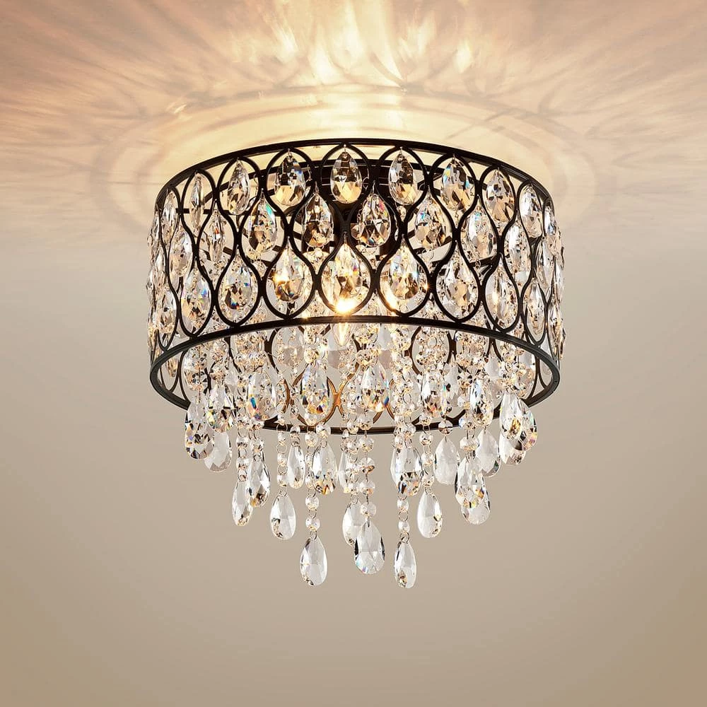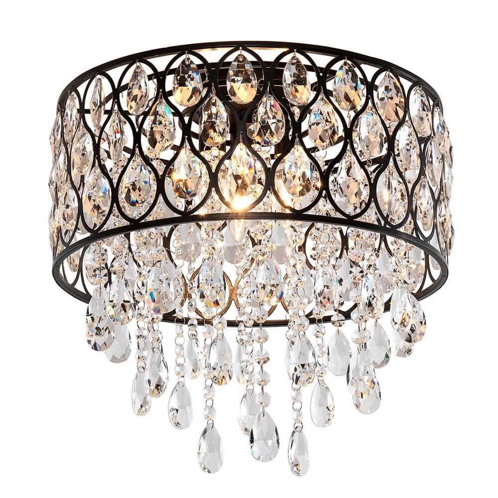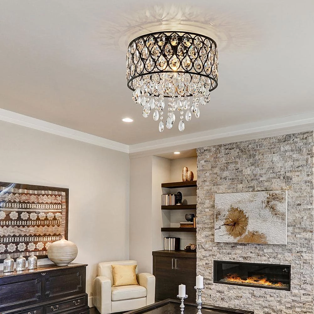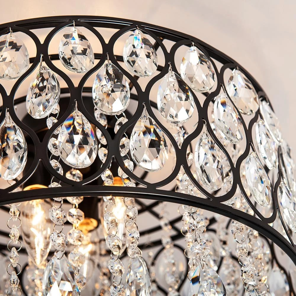 Designed with an iron frame surrounded by shimmering rain-drop crystals, this flush mount presents a charming style. The contained crystal handicraft is with glittering and translucent carving, when combined with a hollow black frame, it emits a more beautiful light to your space. With its elegant silhouette, it can dresses up an entry, seating area or bedroom.
