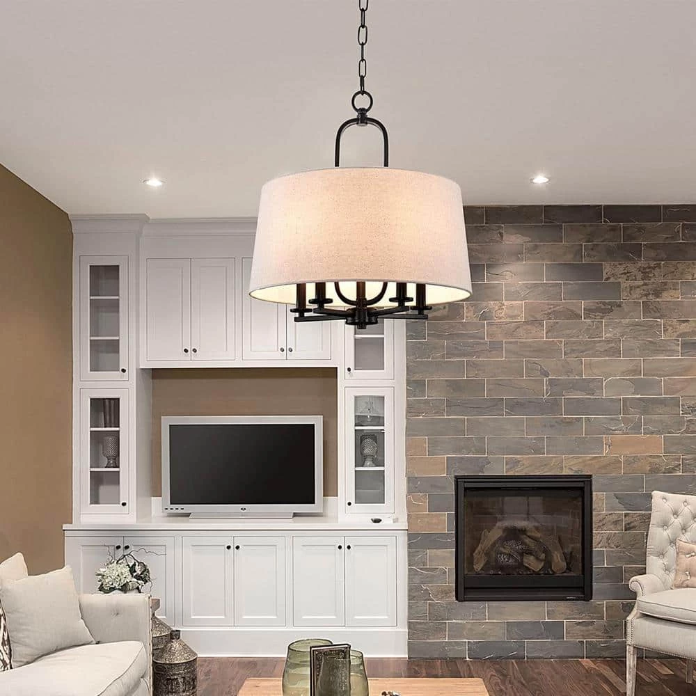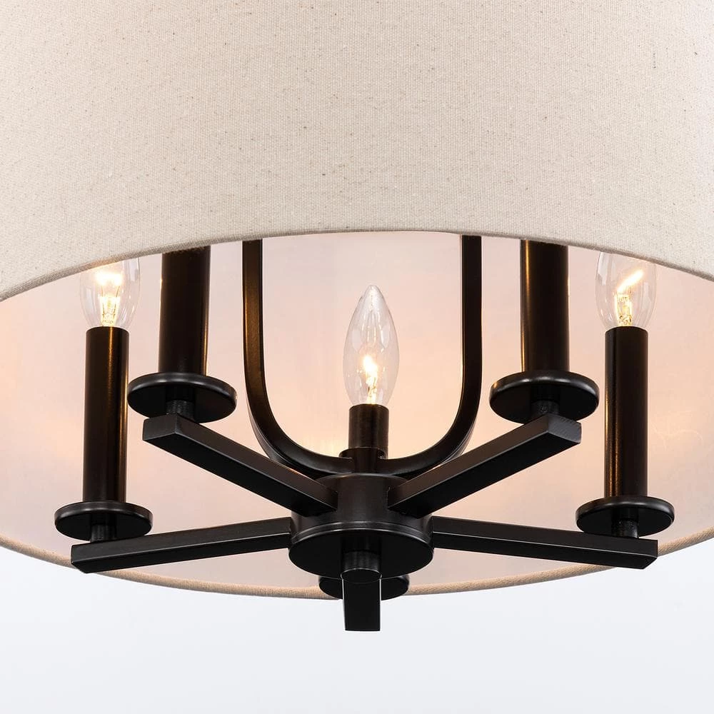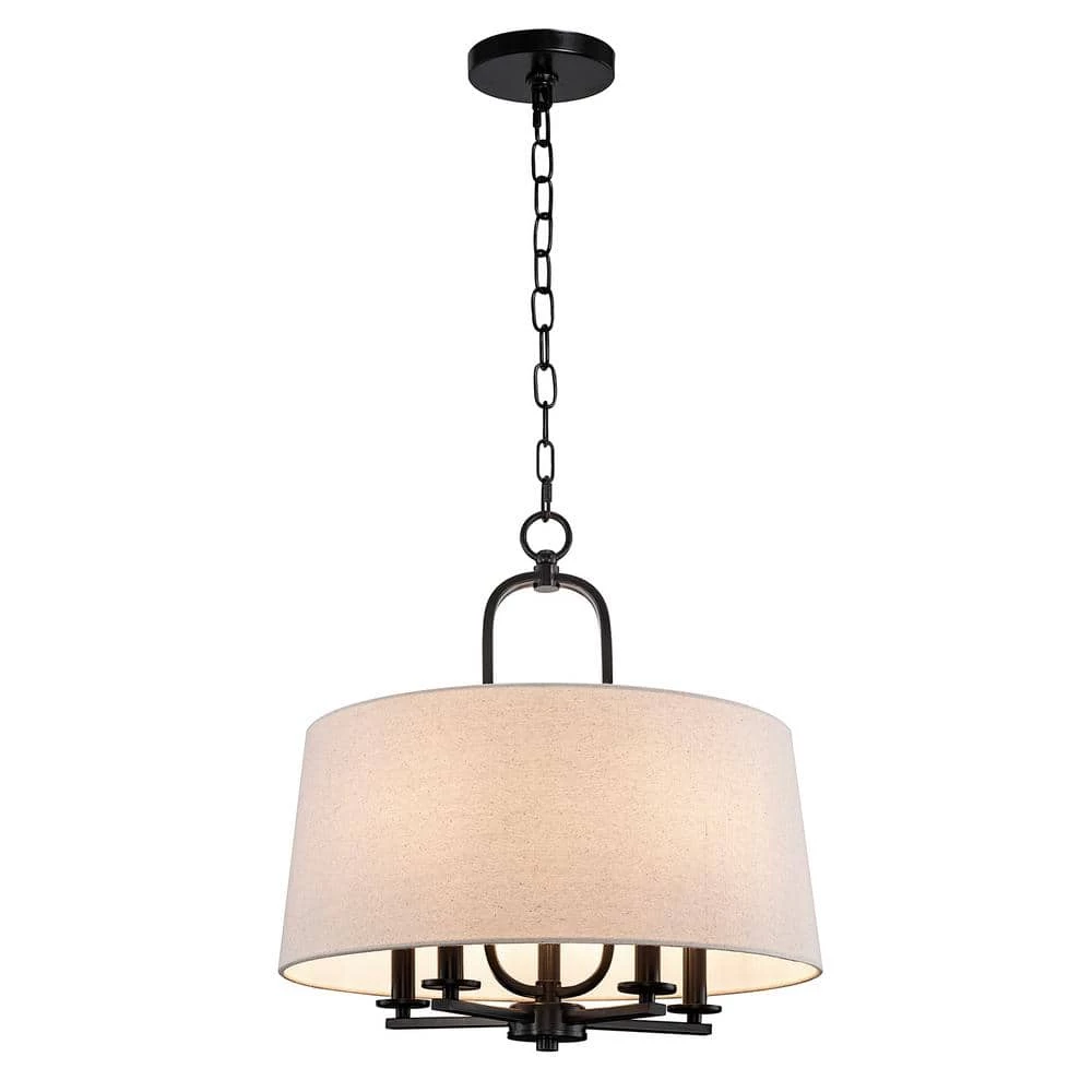 Featuring the blackened bronze metal frame and beige fabric shade, this pendant light combines industrial-era and classy style, create a look that works in both traditional and modern decor. It accommodates five incandescent bulbs of up to 60-Watt each (bulbs not included). With design details, this 5-light chandelier adds a wealth of charm to any space even when the light is not switched on.