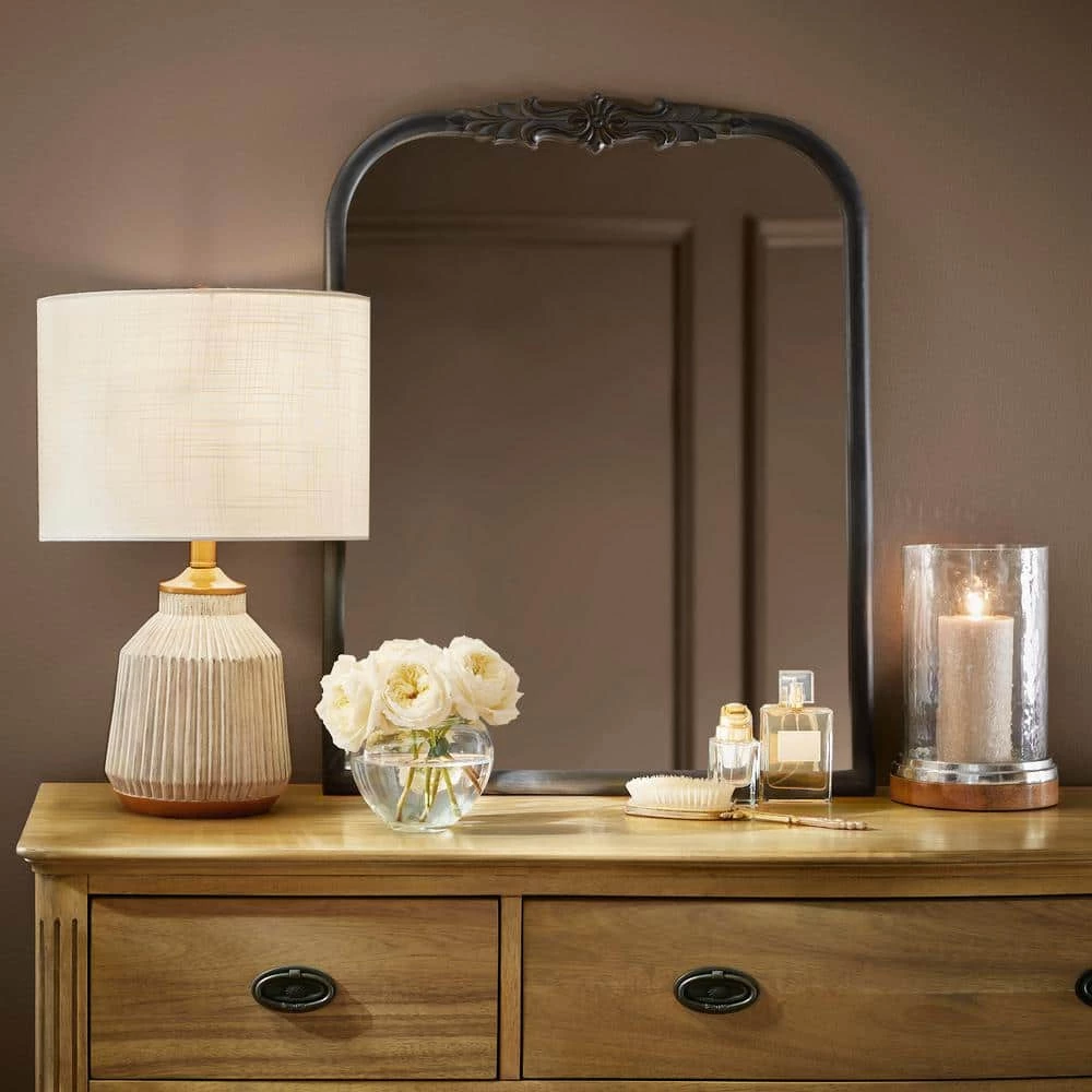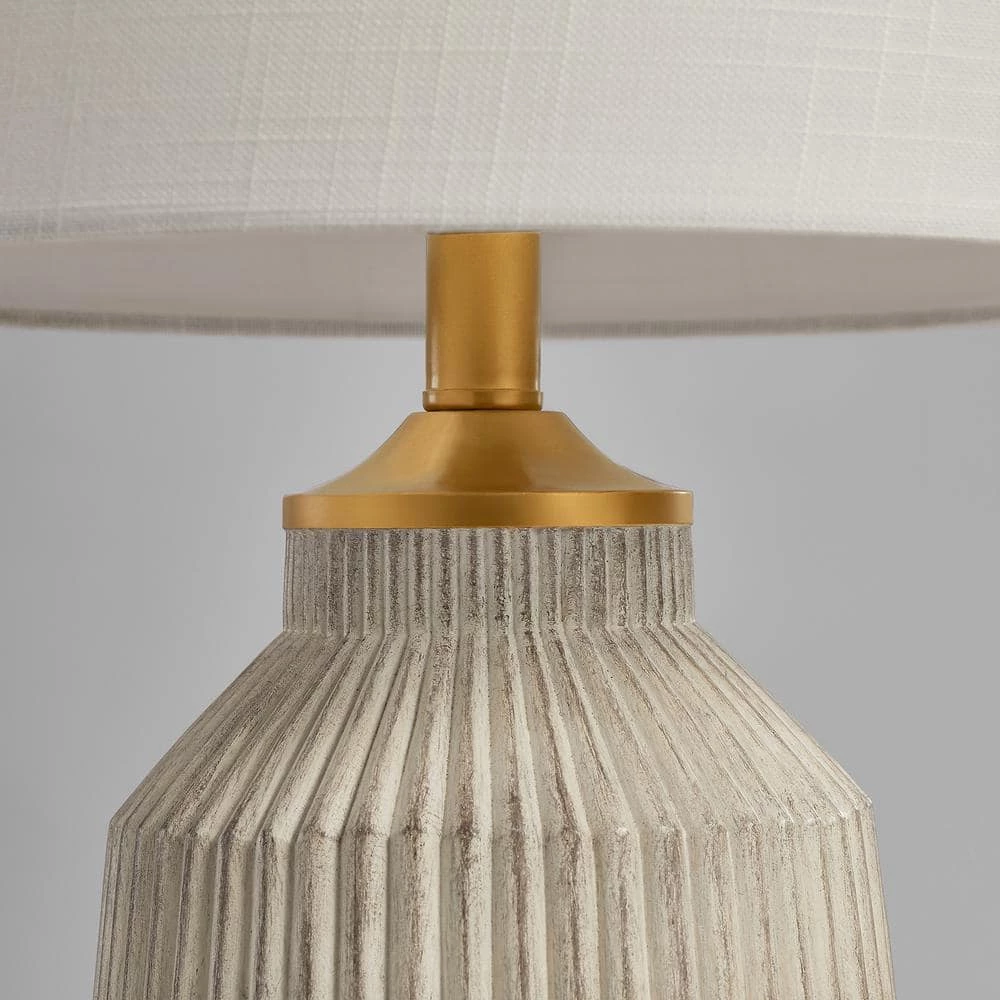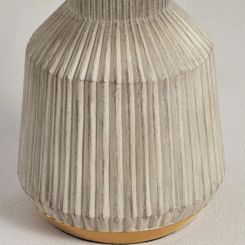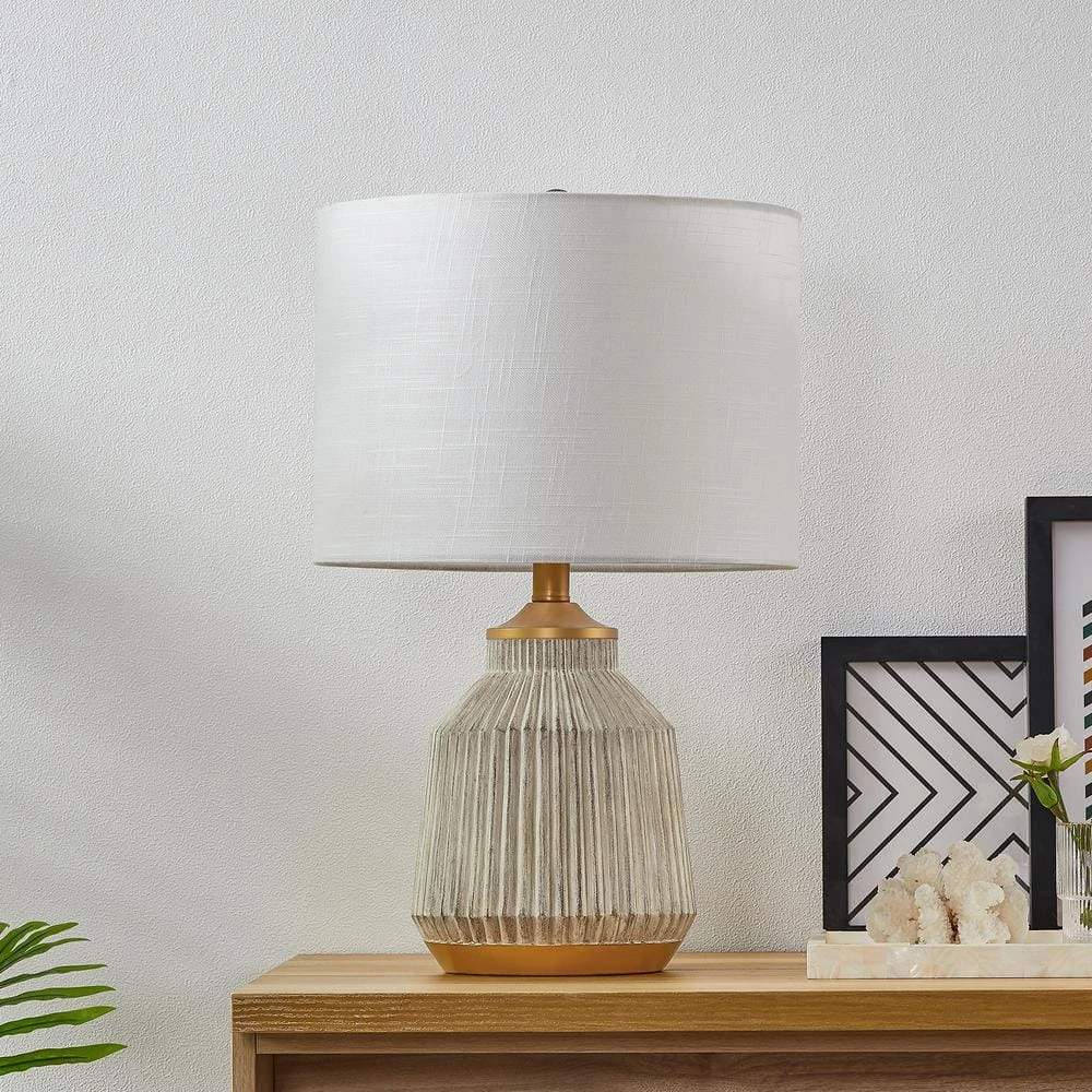 Very boho vibe, this table lamp contains the modern farm house appeal with it’s creamy white base. The base has a beautiful stripe detail and golden highlights. The shade is a lovely with bamboo pattern. You can certainly put it on your vanity desk, entry table, or on a tall end table.