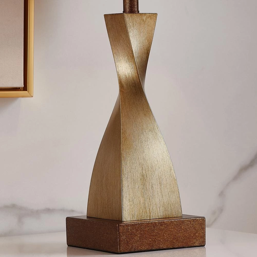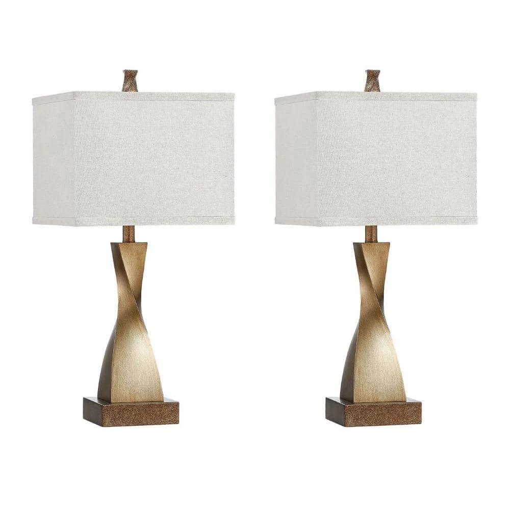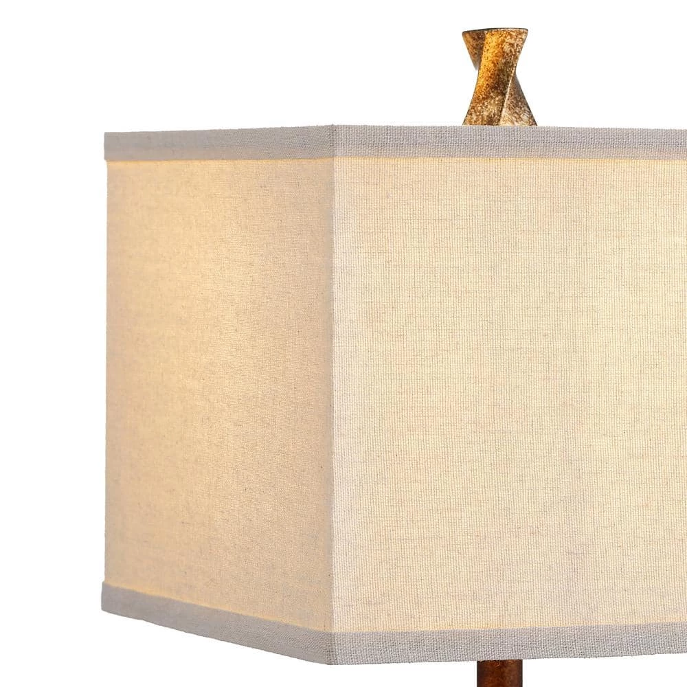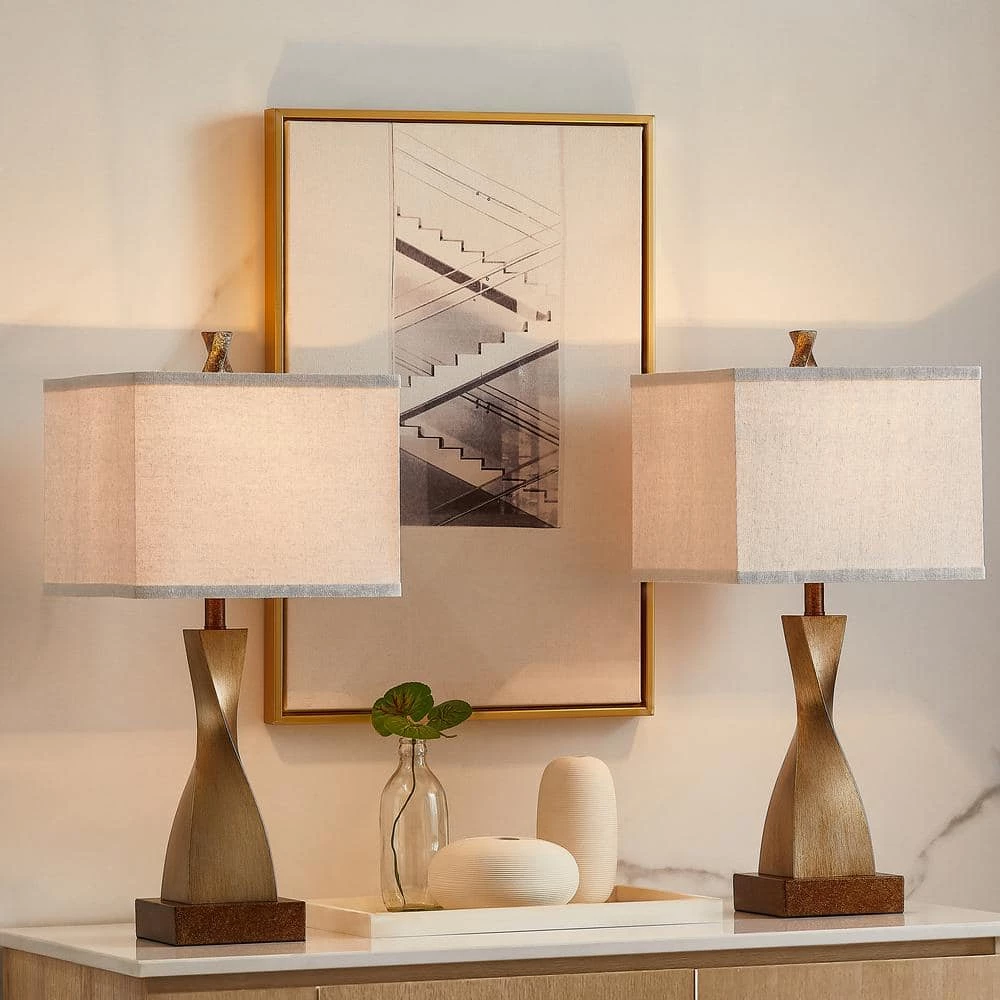This modern 2 pk table lamp set brings a updated look to your living space. The architecturally designed spiral lamp base in weathered finish adds a sculptural touch to your space. 1 USB port and 1 Type C port on the back makes sure your devices stay charged while you watch your favorite show. with cubic fabric shades, this lamp set offers a classic country look, adds a casual and breezy note.