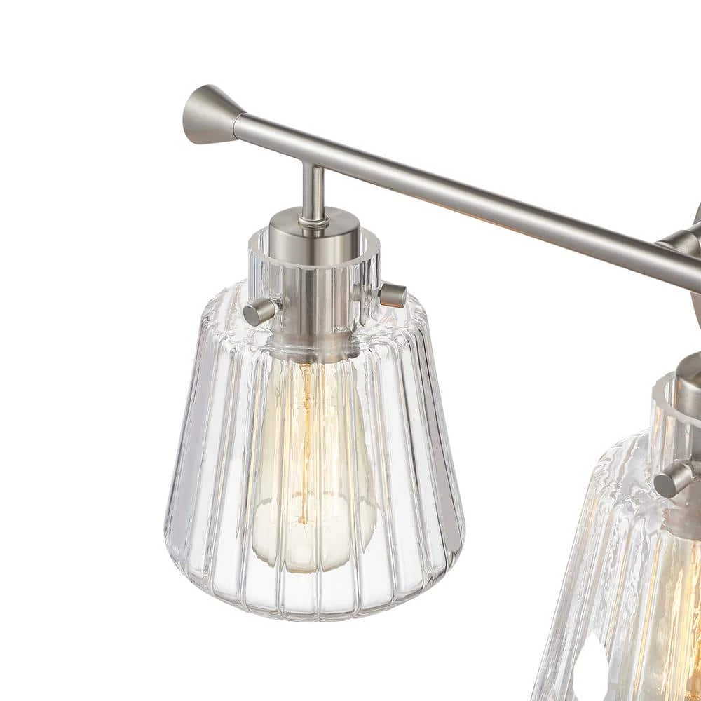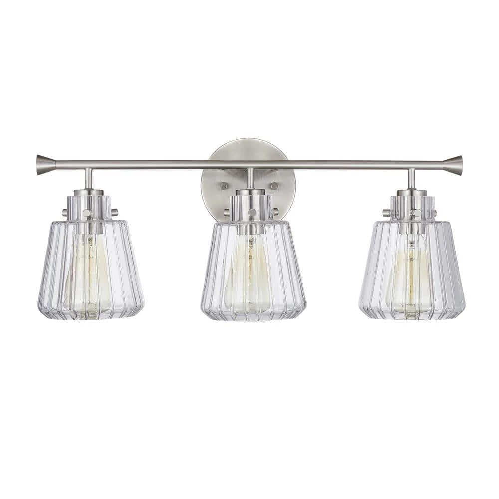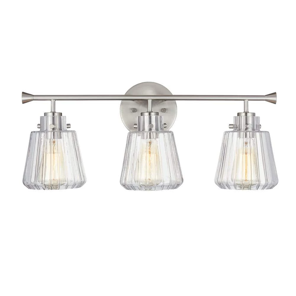 Rippled glass shades diffuse beautiful refracted glow for your bathroom. The metal arm is in brushed nickel finish. A circle canopy at the center creates a minimal and modern vibe. Don’t miss this one for your bathroom renovation!