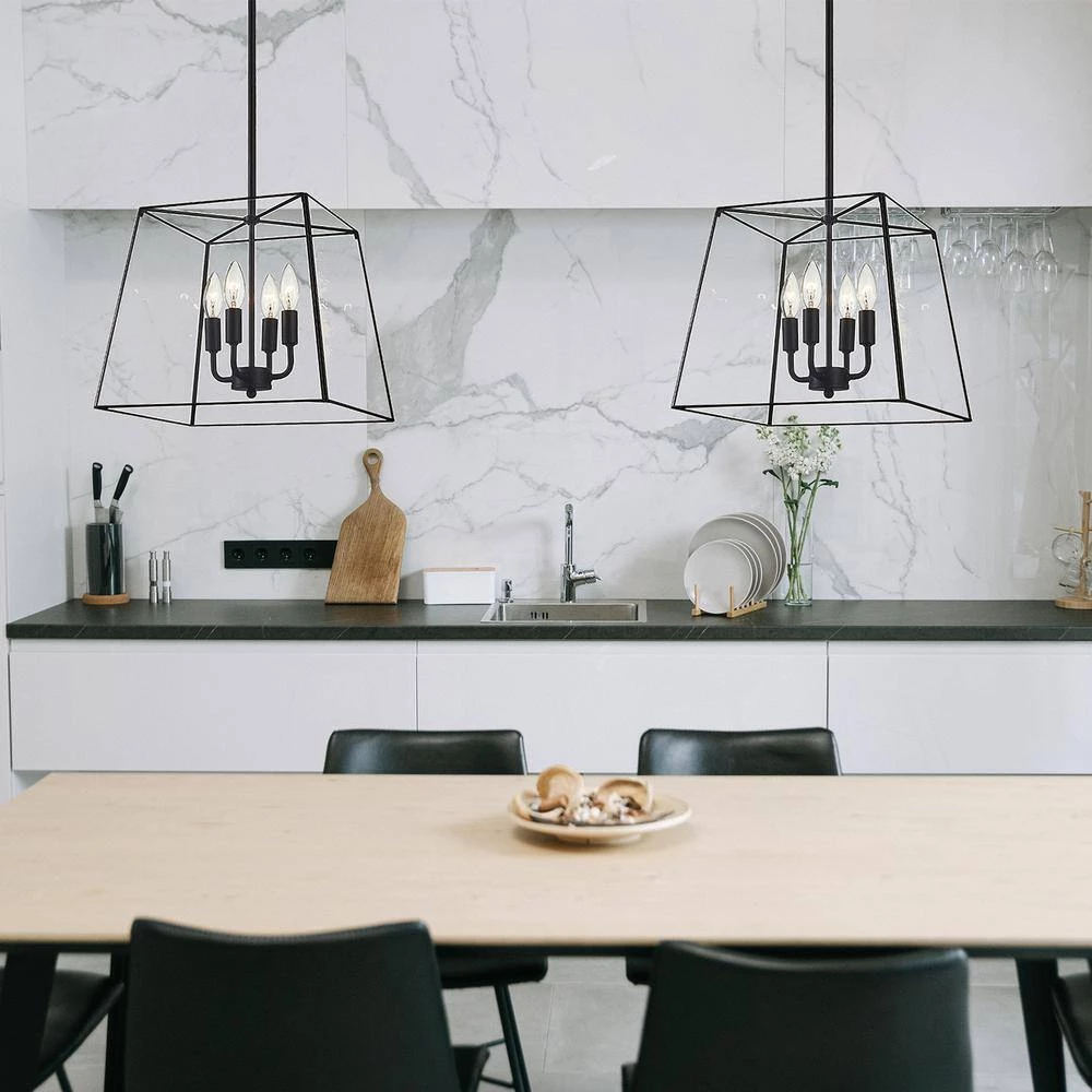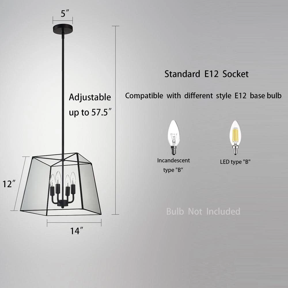 This 4-light Lantern Pendant brings a modern vibe to the room. E12 base light-bulbs are compatible with this pendant light. 1 6 in. and 3 12 in. metal tubes are included for different space height. Multiple scenarios are suitable with this height adjustable pendant: Kitchen Island, Entryway, Corner Nook, Hallways or Dinning Table. Set up your ceiling with this minimal rectangular chandelier now.