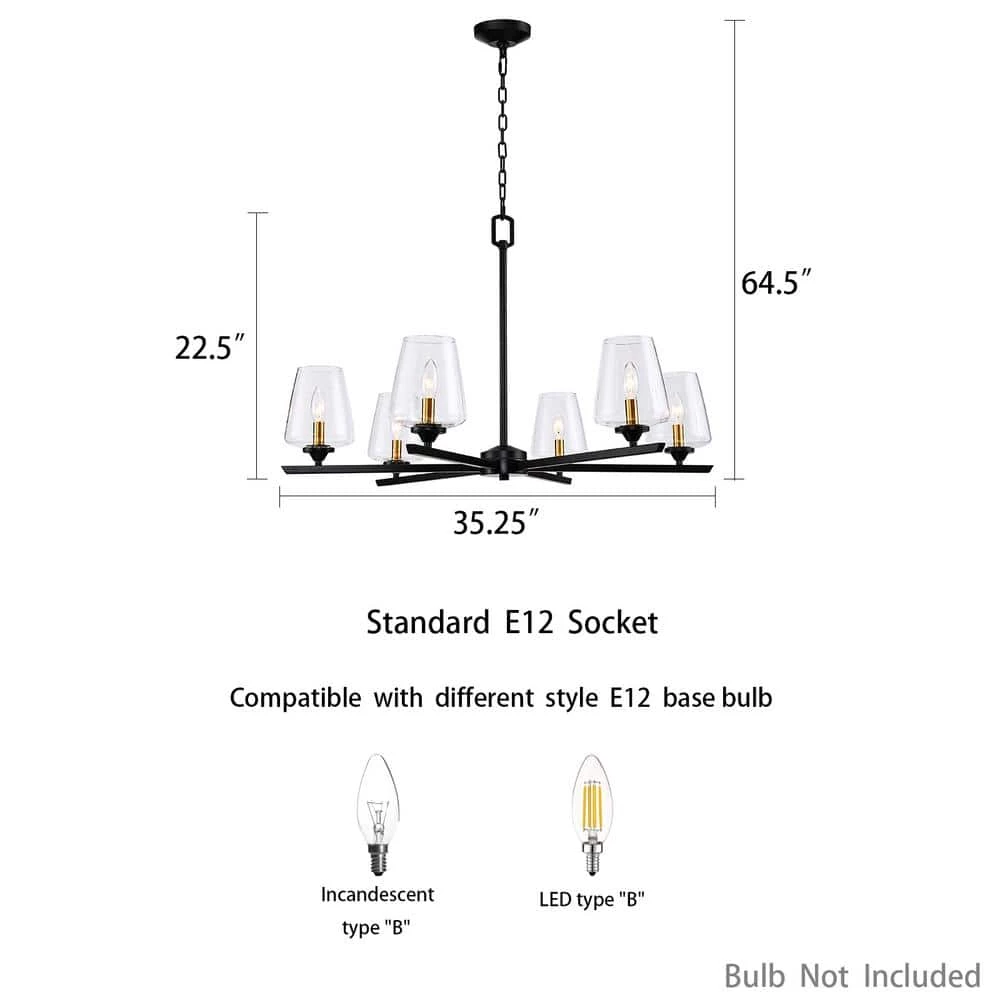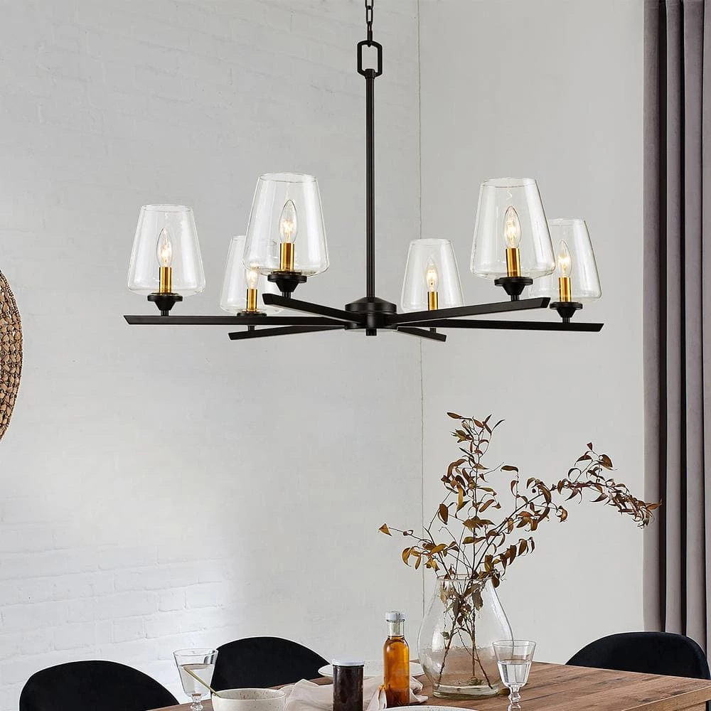 As a contemporary interpretation of a classic chandelier, this pendant showcases a glamorous form. From the center is a vertical cylinder which extent six architecturally designed square arms with elegant upward glass shade, providing luxe and modern ambient light in any space. Make your room stand out with this stunning chandelier.