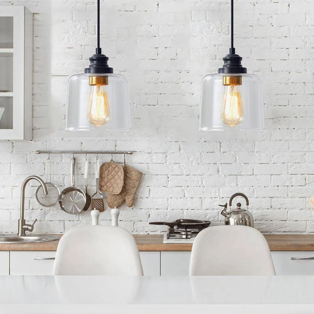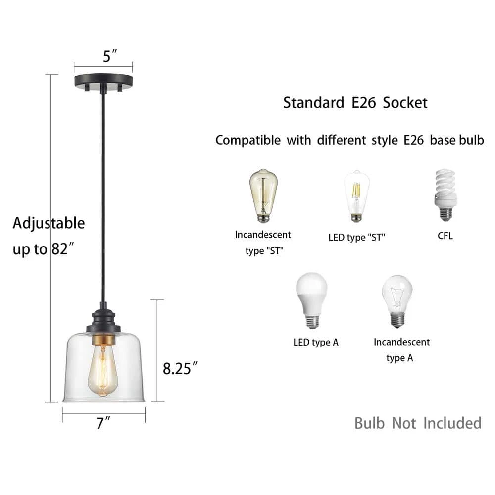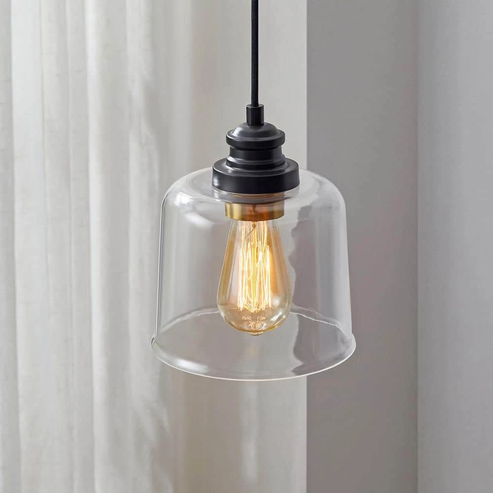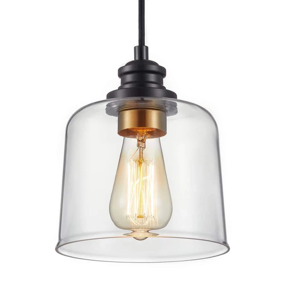This single glass pendant can match with any furnishing style. The minimal look is composed of a transparent glass shade in drum shape and a sturdy bronze canopy. The antique brass socket ring inside the clear shade releases deluxe atmosphere. Adjustable height from 9 in. to 82 in. for all kinds of spaces. This pendant is perfect for illuminating a entryway or lining a few up above the kitchen island to cast a nice glow over morning meals.