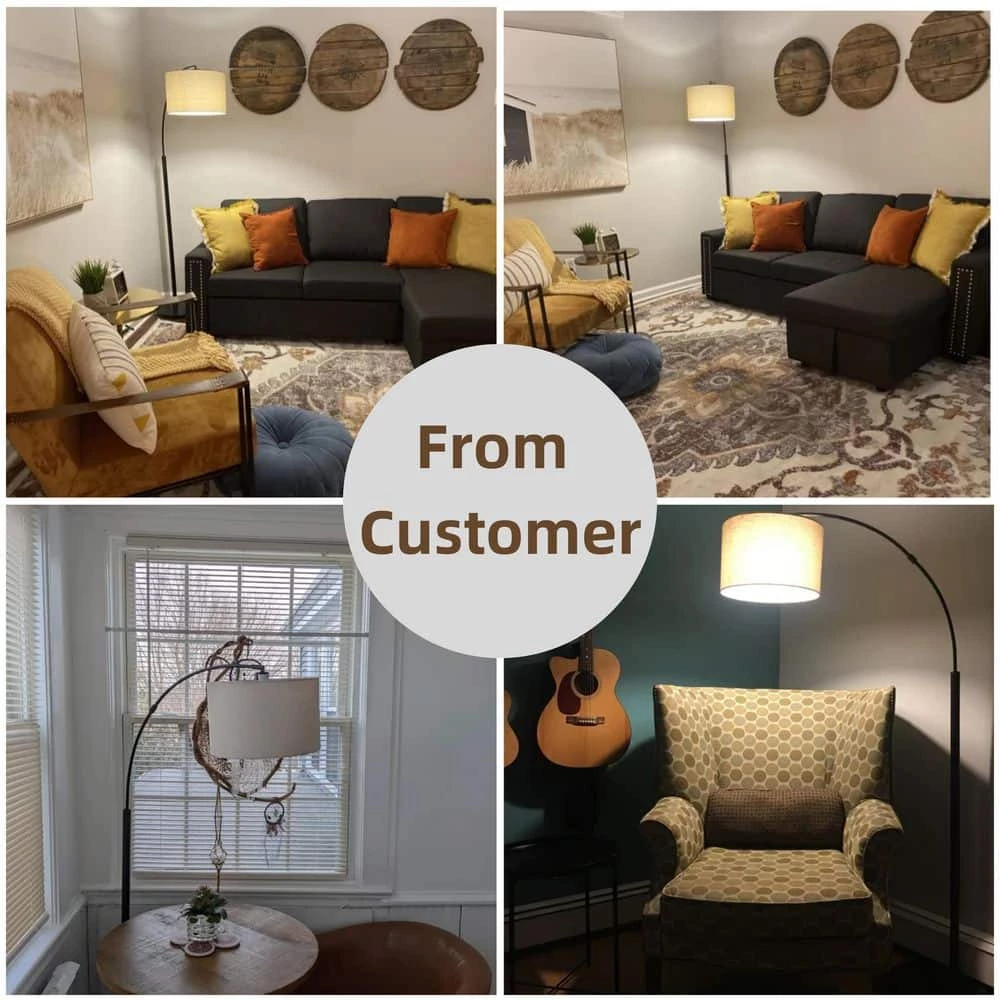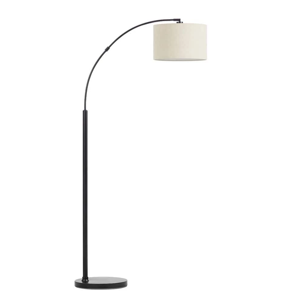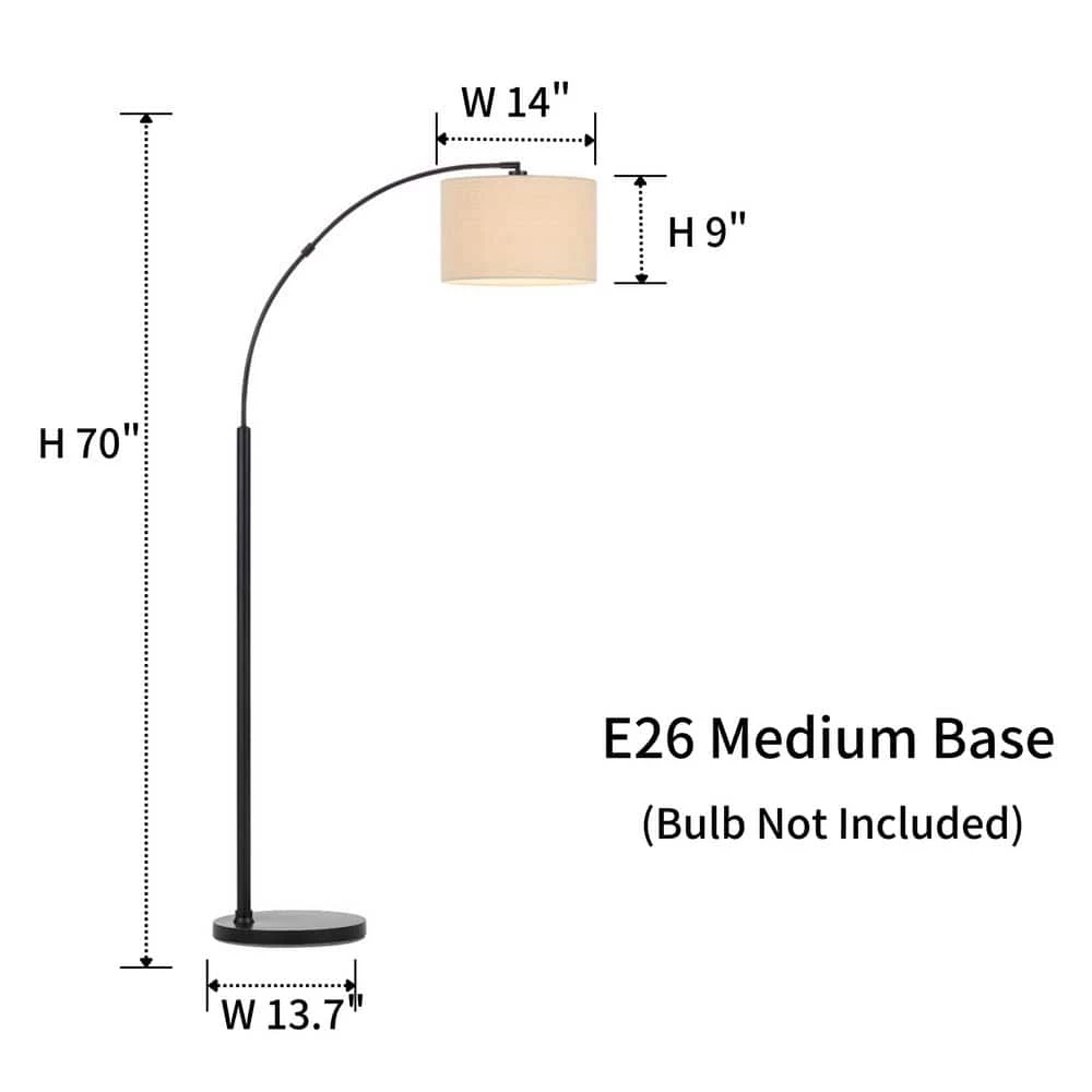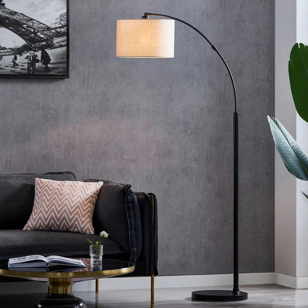 This arched floor lamp presents a minimal look with its bronze lamp body and beige color shade. A weighted base is included for safety and wobble prevention. A simple but versatile lighting solution for your reading nook, coffee table, or any other downward illumination required places.