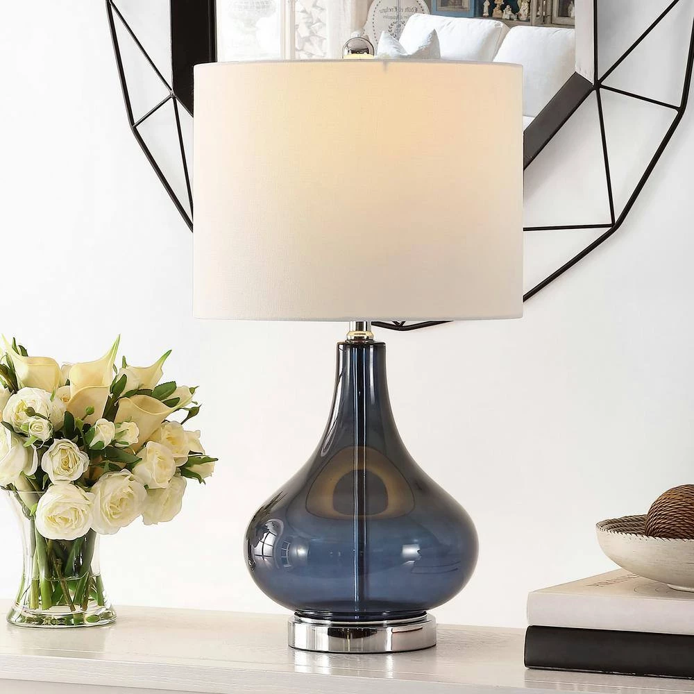 This Brooks Glass Table Lamp a designer must have in contemporary or eclectic decor. Its dramatic curves and elegant blue finish shine beautifully beneath the light gently diffused by its clean white drum shade. Great addition to any room.