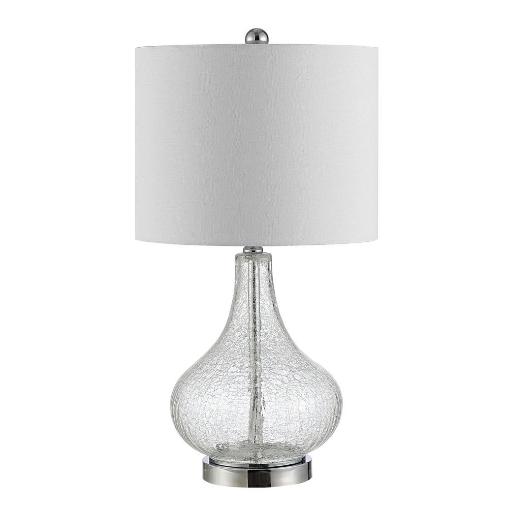 This Brooks Glass Table Lamp a designer must have in contemporary or eclectic decor. Its dramatic curves and elegant clear finish shine beautifully beneath the light gently diffused by its clean white drum shade. Great addition to any room.