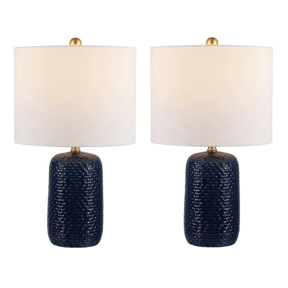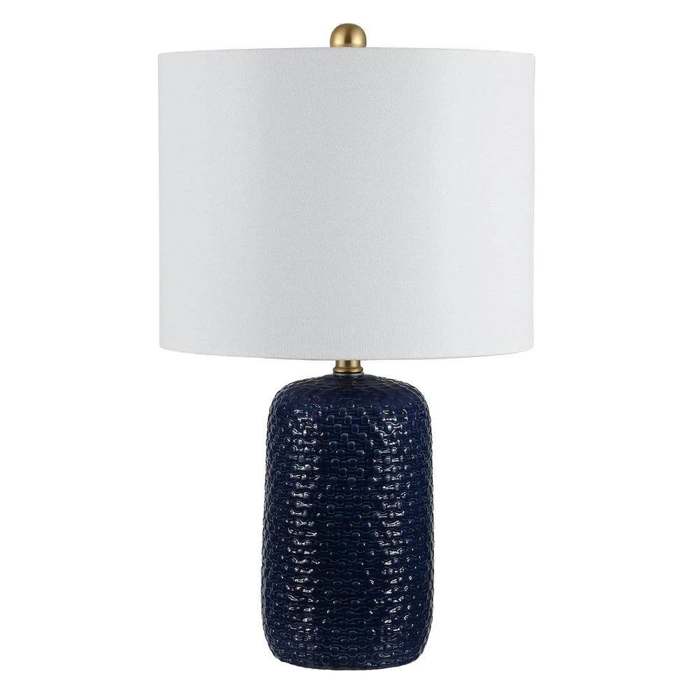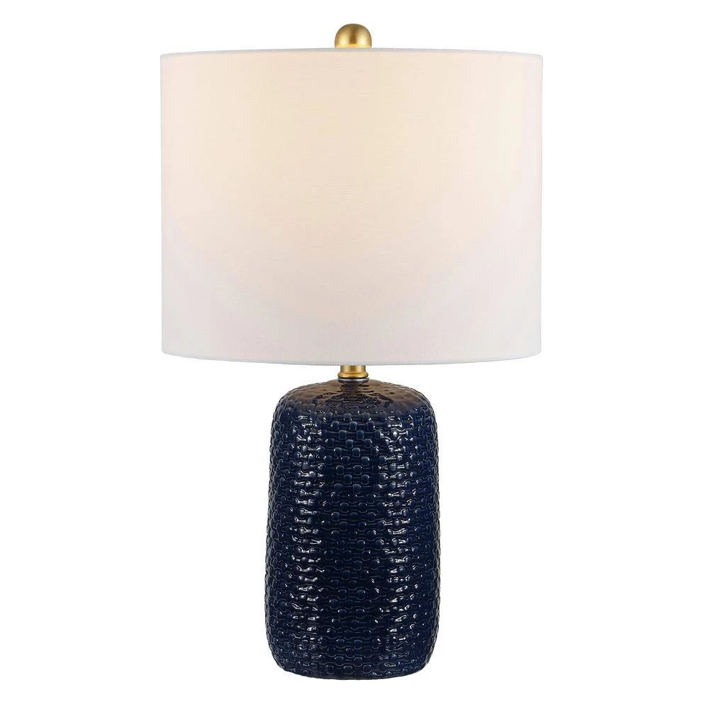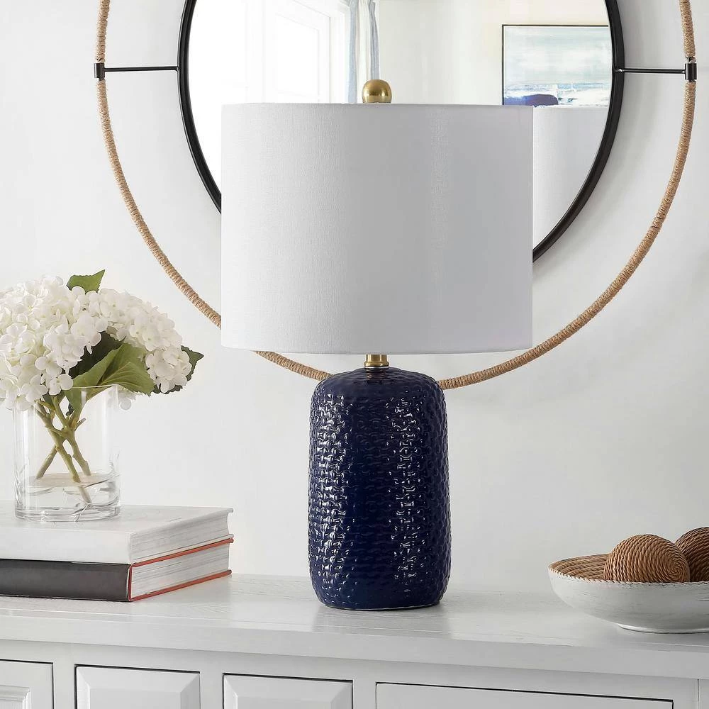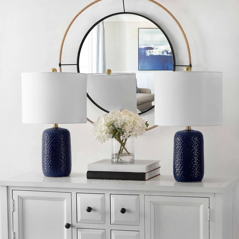 This Huxley Table Lamp abounds with depth and intrigue, making it the ideal piece for contemporary clean lined furnishings. The rippling textured surface of its navy blue ceramic elevates Huxley’s classic cylindrical shape and a sleek drum shade softens its dramatic modern edge. Sold in sets of 2. Great addition to any room.