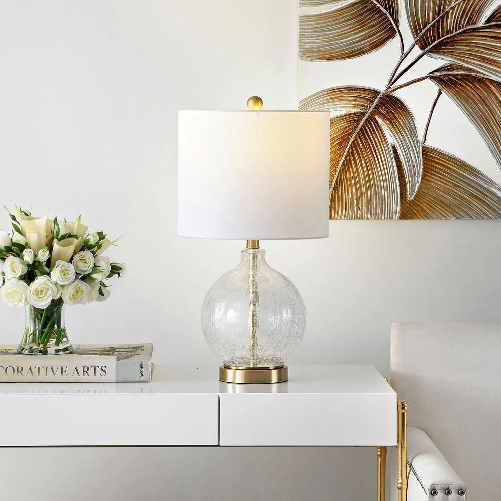 Bring a tasteful touch of sparkle to your decor with this Lovell Table Lamp. Lovell’s dramatically curved silhouette is given a glamorous shimmer with its clear seeded glass and smooth metal pedestal, while a white drum shade allows Lovell to seamlessly shine in any room. Great addition to any room.