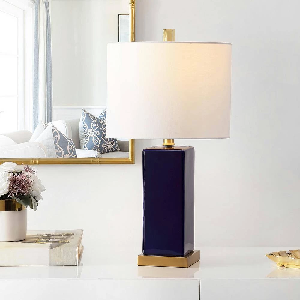 A petite skyscraper for your decor, this Wendi Table Lamp is absolutely iconic. Boldly toned navy ceramic pairs beautifully with its shining pedestal base, making for a streamlined look that perfectly balances its soft white drum shade. Great addition to any room.